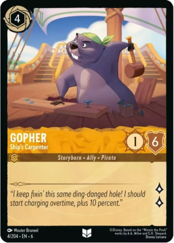 Dive into the magical world of Disney Lorcana with this stunning Gopher card from Set 6: Azurite Sea. This Standard edition card brings charm and strategic depth to your deck, featuring beautiful artwork that captures the essence of this beloved character. Whether you're building a competitive collection or expanding your Lorcana arsenal, this single card is a must-have addition. Perfect for players and collectors alike, secure your copy today and enhance your gameplay experience with one of Set 6's most sought-after cards.